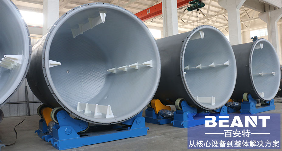 此項工藝技術為一種旋轉燒結成型的工藝,而該項工藝實施的設備也是先進的自動化控制的工藝設備。我公司在應用此項技術的基礎上開發(fā)出雙軸線旋轉成型工藝(雙軸線旋轉成型是由于被制造設備在制造過程中被夾持在一個旋轉體內,而該轉動體使被制造設備呈兩個軸線方向同時轉動,最后制得的設備的工藝過程。)滾涂工藝為整體一次成型,無開裂、無滲透,內襯層與鋼基體之間的粘合力強,當設備處于負壓操作條件下,不會使襯里層被吸癟或被剝離金屬基體表面。