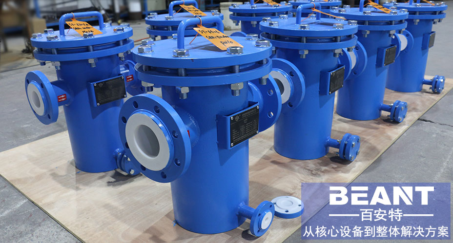 襯氟管道過濾器襯氟管道過濾器主要由接管、筒體、濾籃、法蘭、法蘭蓋及緊固件等組成。安裝在管道上能除去腐蝕性流體中的較大固體雜質(zhì),使機(jī)器設(shè)備(包括壓縮機(jī)、泵等)、儀表能正常工作和運(yùn)轉(zhuǎn),達(dá)到穩(wěn)定工藝過程,保障安全生產(chǎn)的作用。 百安特可根據(jù)不同的介質(zhì)及工況條件選用合適的襯里材料及工藝,為客戶提供全面的過濾解決方案。