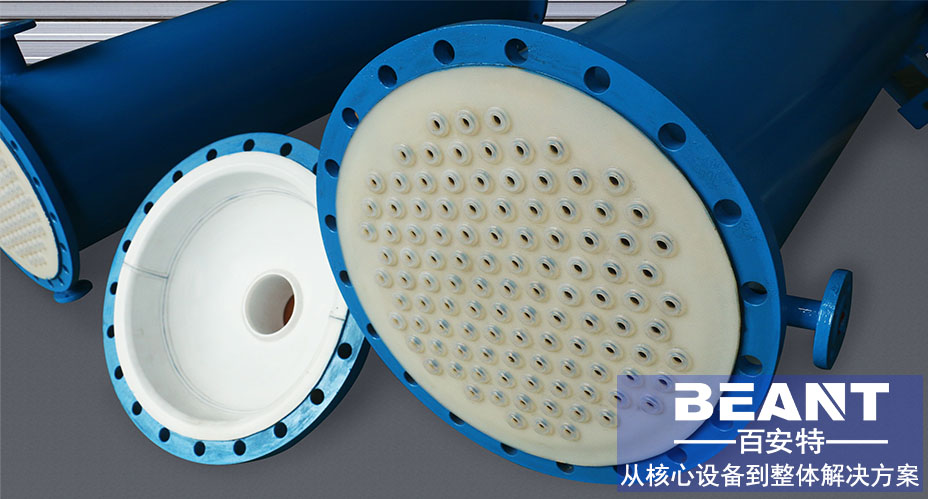 氟塑料列管式換熱器又稱管殼式換熱器。是以封閉在殼體中管束的壁面作為傳熱面的間壁式換熱器。這種換熱器結(jié)構(gòu)較簡單,操作可靠,可用各種結(jié)構(gòu)材料制造,能在高溫、高壓下使用,是目前應(yīng)用廣泛的類型。 百安特可根據(jù)不同的介質(zhì)及工況條件選用合適的襯里材料及工藝,為客戶提供全面的解決方案。